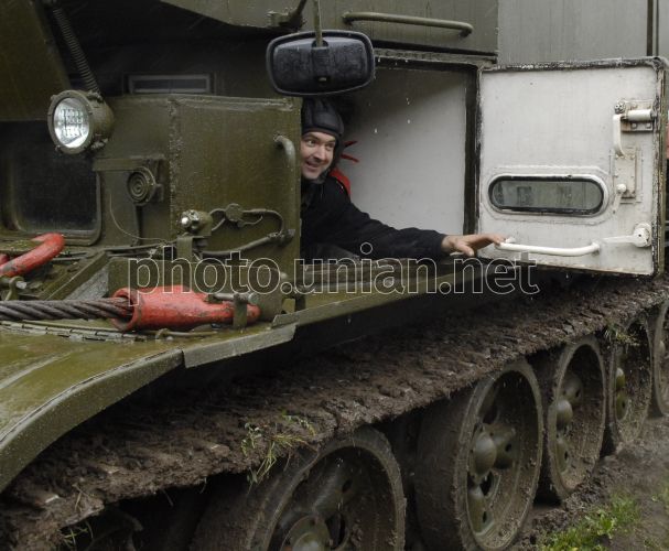 Танкіст під час навчання заходів безпеки і попередження виникнення надзвичайних ситуацій на Центральноій артилерійській базі зберігання боєприпасів Сухопутних військ Збройних Сил України, в с. Росішка, у середу, 17 вересня 2008 р. Цього дня на території артилерійської бази для представників засобів масової інформації було продемонстровано умови зберігання реактивних снарядів, заходи безпеки та попередження виникнення надзвичайних ситуацій. За останні кілька років збільшилася кількість вибухів на військових складах України. Фото Сергія Алексєєнка / УНІАН