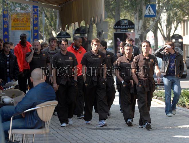 Гравці ФК ”Барселона” (Іспанія) прогулюються на одній з вулиць, у Донецьку, у середу, 1 жовтня 2008 р. Цього дня в Донецьку відбудеться другий матч групового турніру Ліги чемпіонів між ФК «Шахтар» і ФК «Барселона» (Барселона, Іспанія). Фото УНІАН