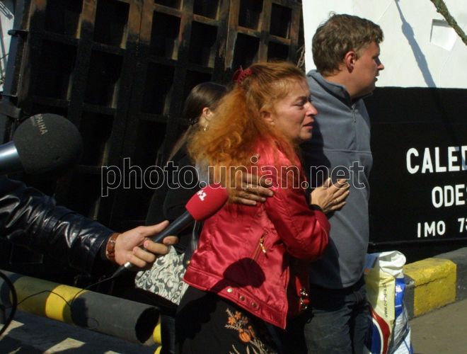 Один із врятованих моряків із затонулої суховантажної баржі ”Лев Толстой” Денис Ахрамєєв з мамою Світланою в одеському порту, у четвер, 2 жовтня 2008 р. Цього дня на чартерному поромі CALEDONIA в одеський порт повернулися два моряки із затонулого поблизу Болгарії судна «Лев Толстой» - Андрій Крижановський і Денис Ахрамєєв. В суботу, 27 вересня 2008 р., біля берегів Болгарії затонуло українське транспортне судно ”Лев Толстой”, що йшло під північнокорейським прапором. На борту судна знаходилося десять чоловік: капітан (громадянин Російської Федерації) і дев’ять членів екіпажа (громадяни України). За даними представника судновласника, на судні знаходилося п’ять рятувальних плотів. Болгарські рятувальні служби виявили рятувальний буй і пліт з судна «Лев Толстой» в Чорному морі в 30 милях на південь від міста Варни біля мису Емін. Двох українців із затонулого судна на плоту підібрала бельгійська яхта «Міраж». Фото Петра Катіна / УНІАН
