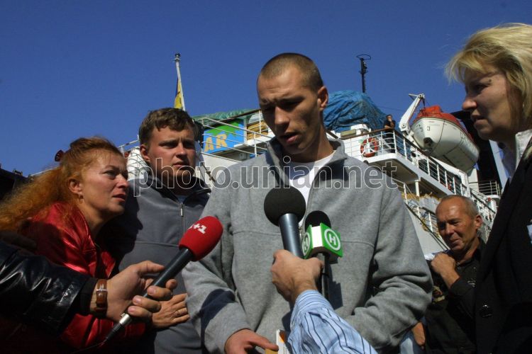 Журналісти беруть інтерв'ю у врятованих із затонулої суховантажної баржі ”Лев Толстой” моряків Дениса Ахрамєєва, на задньому плані, та Андрія Крижановського в одеському порту, у четвер, 2 жовтня 2008 р. Цього дня на чартерному поромі CALEDONIA в одеський порт повернулися два моряки із затонулого поблизу Болгарії судна «Лев Толстой» - Андрій Крижановський і Денис Ахрамєєв. В суботу, 27 вересня 2008 р., біля берегів Болгарії затонуло українське транспортне судно ”Лев Толстой”, що йшло під північнокорейським прапором. На борту судна знаходилося десять чоловік: капітан (громадянин Російської Федерації) і дев’ять членів екіпажа (громадяни України). За даними представника судновласника, на судні знаходилося п’ять рятувальних плотів. Болгарські рятувальні служби виявили рятувальний буй і пліт з судна «Лев Толстой» в Чорному морі в 30 милях на південь від міста Варни біля мису Емін. Двох українців із затонулого судна на плоту підібрала бельгійська яхта «Міраж». Фото Петра Катіна / УНІАН