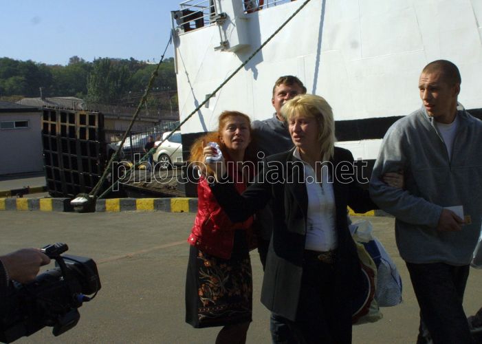 Врятовані із затонулої суховантажної баржі ”Лев Толстой” моряки Денис Ахрамєєв, на задньому плані, з мамою Світланою, та Андрій Крижановський в одеському порту, у четвер, 2 жовтня 2008 р. Цього дня на чартерному поромі CALEDONIA в одеський порт повернулися два моряки із затонулого поблизу Болгарії судна «Лев Толстой» - Андрій Крижановський і Денис Ахрамєєв. В суботу, 27 вересня 2008 р., біля берегів Болгарії затонуло українське транспортне судно ”Лев Толстой”, що йшло під північнокорейським прапором. На борту судна знаходилося десять чоловік: капітан (громадянин Російської Федерації) і дев’ять членів екіпажа (громадяни України). За даними представника судновласника, на судні знаходилося п’ять рятувальних плотів. Болгарські рятувальні служби виявили рятувальний буй і пліт з судна «Лев Толстой» в Чорному морі в 30 милях на південь від міста Варни біля мису Емін. Двох українців із затонулого судна на плоту підібрала бельгійська яхта «Міраж». Фото Петра Катіна / УНІАН