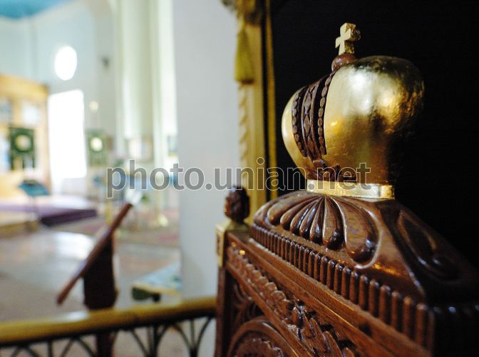 FILE Спинка ”Крісла Імператриці” в Спаському (Єкатерининському) Соборі у Херсоні, у четвер, 30 жовтня 2008 р. У 1781 р. генерал-губернатор Новоросійського краю Григорій Потьомкін вирішив побудувати на місці гарнізонної дерев’яної церкви святого архангела Михайла 1779 р. кам’яний собор. Собор був споруджений в ім’я святої великомучениці Катерини - небесної покровительки Катерини II. Імператрицю, яка відвідала собор, збентежило таке очевидне присвячення їй церкви, і вона нарекла собор Спаським. Спеціально до приїзду Катерини в соборі, поруч правого стовпа проти вівтаря було встановлено крісло. Це крісло стало справжньою реліквією собору, але було загублене в ході історичних подій ХХ ст. Зараз у Спаському Соборі виставлена копія ”Крісла Імператриці”. Її виготовили херсонські умільці. Крісло виконане за зразком експонату Державного Ермітажу (Санкт-Петербург, Росія) - крісла кінця XVIII ст., і повністю відповідає стилю, що домінував з єкатерининських часів в Росії, - класицизму. Крісло обтягнуте сукном зеленого кольору, поширеним ту епоху, а в овал спинки вписано вензель імператриці Катерини II. В процесі виробництва використані цінна порода червоного дерева сіпо, саєрлак на основі природних складових, ґрунти шеллаки на основі ялицевої смоли, індійська парча, позолочена нитка. При виготовленні всі роботи проводилися уручну. Застосовані технології: ручне фігурне об’ємне різьблення з використанням розгорненого кута і дерев’яних механічних кріплень, ручне шліфування, художня вишивка гладінню золотом, 8-разове лакування та нанесення сухозлітного золота. Фото Віталія Данильченка / УНІАН