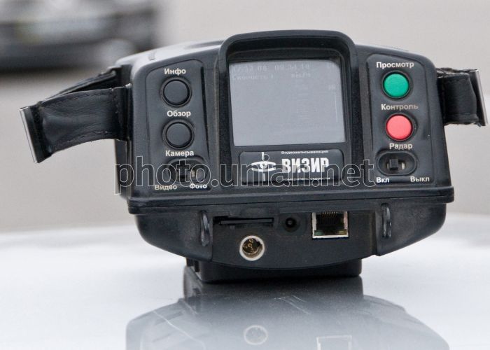 Відеозаписуючий вимірник швидкості «Візир», в Запоріжжі, у понеділок, 17 листопада 2008 р. Прилад не тільки вимірює швидкість рухомих транспортних засобів, але і дозволяє робити фото та відео запис порушників, що є незаперечним доказом при рішенні конфліктних ситуацій. Радар дозволяє вимірювати швидкість в стаціонарному і патрульному режимі на відстані не менше 400 м. «Візир» може працювати в двох режимах: контроль з вимірюванням швидкості та контроль без вимірювання швидкості. У першому випадку, за допомогою функції «Радар», інспектором задається поріг швидкості. Якщо зміряна швидкість більше встановленого порогу, прилад зробить знімок одного кадру або почне відеозапис. Прилад забезпечує внесення до кадру інформацію про дату, час і швидкість тарнспортного засобу. У другому випадку, прилад може бути використаний як фотоапарат або відеокамера, наприклад для фотографування місця ДТП. Зроблені кадри зберігаються в незалежному архіві. Вартість приладу складає близько 17 тисяч гривень. Фото Олександра Прилепи / УНІАН