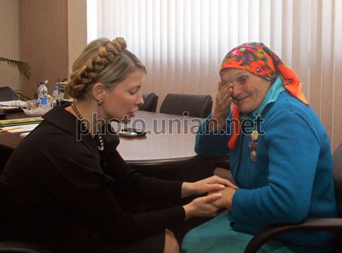 COMM Екс-прем'єр-міністр України Юлія Тимошенко, зліва, веде бесіду з героїнею Помаранчевої революції, володаркою ордена княгині Ольги третього ступеня Параскою Королюк в Києві в п'ятницю, 23 вересня 2005 р. Королюк прожила на Майдані Незалежності всю Помаранчеву революцію, щодня її бачили в перших рядах захисників Майдану, ходила по вулицях в накидці з помаранчевих стрічок і стала своєрідним талісманом Майдану.