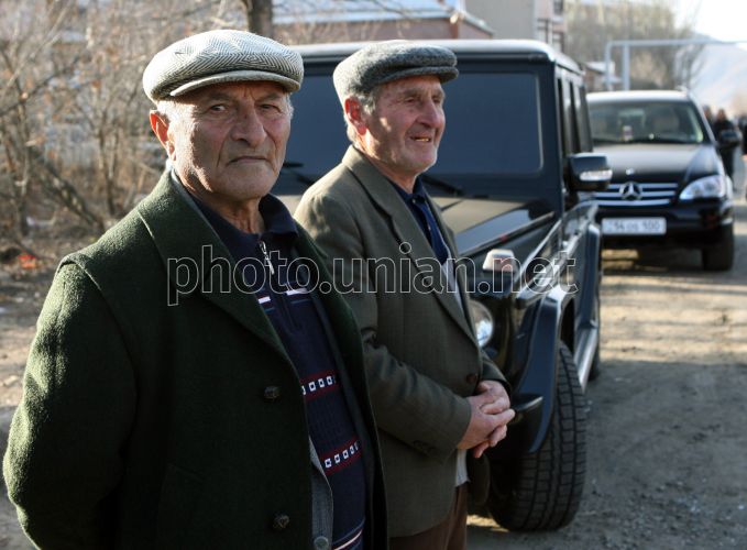 Місцеві мешканці стоять поруч автомобілів, на яких приїхали представники влади Лорійської обл. Вірменії, у м. Спітак (Республіка Вірменія), у п’ятницю, 5 грудня 2008 р. Цього дня, в рамках робочої поїздки до Вірменії, лідер Партії регіонів Віктор Янукович взяв участь у заходах, присвячених 20-й річниці Спітакського землетрусу у Спітаку та Гюмрі (колишній Ленінакан), що стався 7 грудня 1988 р., і практично вщент зруйнував ці два міста. У той час Янукович працював генеральним директором великого виробничого об’єднання ”Донбастрансремонт”. Він брав активну участь у наданні допомоги потерпілим від землетрусу. Під його керівництвом відбувалися комплектація рятувальних загонів і будівельних підрозділів, організація їх роботи на місці аварії, забезпечення робіт з ліквідації наслідків землетрусу необхідними матеріалами та механізмами. Фото Андрія Мосієнка / прес-служба Партії регіонів / УНІАН
