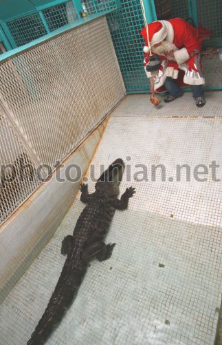 Працівник розплідника ”Шоу крокодилів” у костюмі Діда Морозу годує крокодила, в Євпаторії, у вівторок, 30 грудня 2008 року.Фото Олексія Сувірова / УНІАН