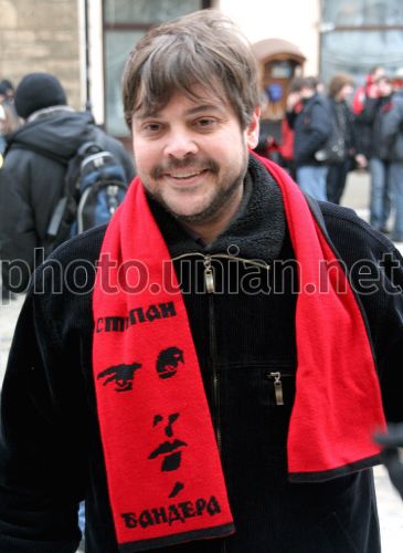 Внук Степана Бандери - Степан, під час флешмобу, присвяченого 80-річчю з дня створення Організації українських націоналістів, тримають над собою червоно-чорні шарфи із зображенням Степана Бандери, у Львові, у вівторок, 3 лютого 2009 р. Учасники флешмобу вибудували живий напис ”ОУН”. Фото Петра Задорожного / УНІАН