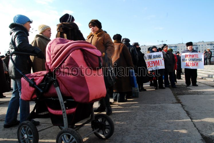 Працівники ДП ”Хімпром” під час акції протесту в Першотравневому (Харківська обл.), в середу, 18 лютого 2009 р. Цього дня співробітники ”Хімпрому” провели акцію протесту, вимагаючи погасити заборгованість із заробітної плати. У акції протесту взяли участь близько 200 чоловік: працівники заводу і ті, хто звільнився або потрапив під скорочення. Зараз на заводі працює менше 170-ти осіб, раніше колектив сягав майже двох тисяч. Працівники заводу стверджують, що заборгованість із заробітної плати на підприємстві складає 12 млн. грн. Директор ”Хімпрому” називає суму в два рази меншу і обіцяє погасити заборгованість щойно буде продано частину устаткування – в квітні - травні. Учасники акції поставили умову: зарплатня через місяць або ж вони перекриють залізничну гілку. Фото Ігоря Чекачкова / УНІАН