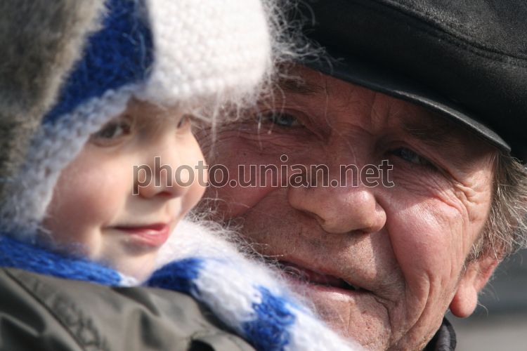 Працівник ДП ”Хімпром” тримає на руках онука під час акції протесту в Першотравневому (Харківська обл.), в середу, 18 лютого 2009 р. Цього дня співробітники ”Хімпрому” провели акцію протесту, вимагаючи погасити заборгованість із заробітної плати. У акції протесту взяли участь близько 200 чоловік: працівники заводу і ті, хто звільнився або потрапив під скорочення. Зараз на заводі працює менше 170-ти осіб, раніше колектив сягав майже двох тисяч. Працівники заводу стверджують, що заборгованість із заробітної плати на підприємстві складає 12 млн. грн. Директор ”Хімпрому” називає суму в два рази меншу і обіцяє погасити заборгованість щойно буде продано частину устаткування – в квітні - травні. Учасники акції поставили умову: зарплатня через місяць або ж вони перекриють залізничну гілку. Фото Ігоря Чекачкова / УНІАН