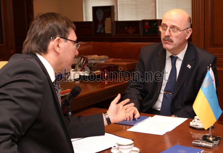 Міністр внутрішніх справ України Юрій Луценко, ліворуч, та посол Грузії в Україні Грігол Катамадзе спілкуються під час зустрічі у Києві, в середу, 18 лютого 2009 р. Під час зустрічі Луценко заявив, що виступає за покращення взаємодії органів внутрішніх справ України та Грузії для боротьби зі злочинністю. Міністр зазначив, що необхідні нові заходи Міністерств внутрішніх справ двох країн, які дозволять нейтралізувати небажані кримінальні елементи. Луценко внутрішніх справ назвав роботу грузинської поліції ефективною, і саме через це, за його словами, чимало злочинних елементів залишають Грузію і у пошуках наживи перебираються до інших країн, зокрема України. У свою чергу грузинська влада готова спільно з українськими правоохоронними органами вжити додаткових заходів з протидії злочинності. Луценко запропонував кілька конкретних кроків з поліпшення взаємодії працівників органів внутрішніх справ обох держав. Це, зокрема, екстрені зустрічі на рівні керівництва МВС двох країн, створення спільної групи. Також міністр запропонував вивчити питання запровадження реєстрації для окремих категорій громадян Грузії, які приїжджають в Україну. Луценко підкреслив, що йдеться, перш за все, про тих громадян Грузії, які мають у себе на батьківщині проблеми із законом. Фото Олександра Косарєва / УНІАН