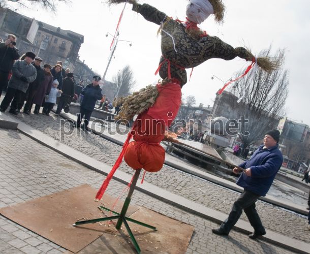Робочий підпалює чучело, що символізує зиму, під час святкування Масляниці, у Запоріжжі, в п’ятницу, 27 лютого 2009 р. Учасники святкування Масляниці змагалися у випіканні та поїданні млинців. Бажаючі могли приміряти козацькі костюми. Святкування завершилося спаленням опудала, що символізує зиму. Масляна (Масниці, Масляниця, сирна неділя) - давньослов’янське свято на честь весняного пробудження природи. Після хрещення Русі Масляниця святкується в останній тиждень перед Великим постом, за сім тижнів до Великодня. Головними атрибутами свята є млинці і народні гуляння. Християнська церква включила Масляну у свій календар, проте вона так і не набула релігійного змісту. Фото Анатолія Мудрика / УНІАН