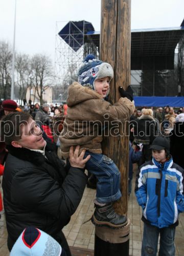 Хлопчик намагається залізти на дерев'яний стовп під час народних гулянь на святкуванні Масляниці, у Донецьку, у суботу, 28 лютого 2009 р. Масляна (Масниці, Масляниця, сирна неділя) - давньослов’янське свято на честь весняного пробудження природи. Після хрещення Русі Масляниця святкується в останній тиждень перед Великим постом, за сім тижнів до Великодня. Головними атрибутами свята є млинці і народні гуляння. Християнська церква включила Масляну у свій календар, проте вона так і не набула релігійного змісту. Фото УНІАН