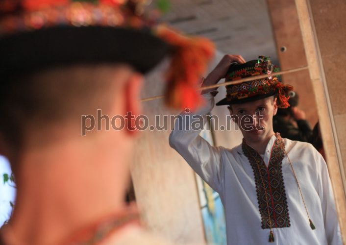 Чоловік в українському національному костюмі міряє гуцульський капелюх під час проведення “Гуцульських забав” у Львові, в неділю, 1 березня 2009р. Мета проведення “Гуцульських забав” ознайомити мешканців Львову та гостей міста з культурою етнографічних регіонів України за допомогою проведення тематичних етно-вечірок. Фото Петра Задорожного / УНІАН