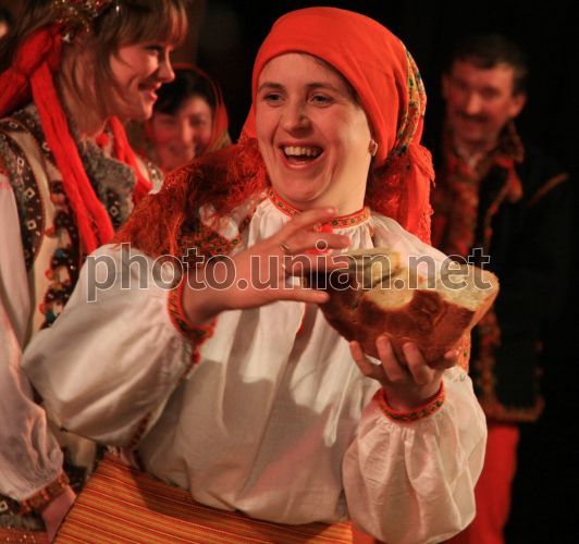 Жінка в українському національному костюмі тримає в руках шматок караваю під час проведення “Гуцульських забав” у Львові, в неділю, 1 березня 2009р. Мета проведення “Гуцульських забав” ознайомити мешканців Львову та гостей міста з культурою етнографічних регіонів України за допомогою проведення тематичних етно-вечірок. Фото Петра Задорожного / УНІАН