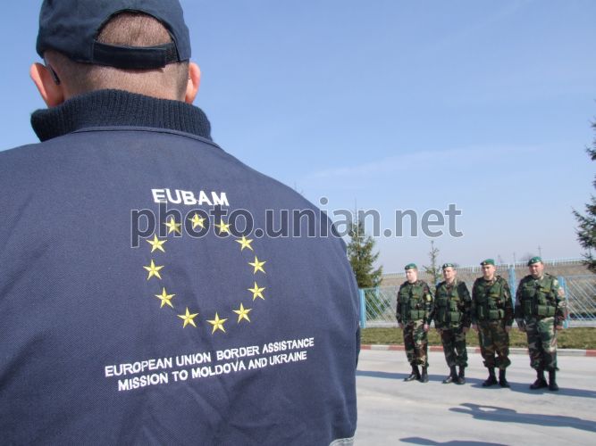Співробітник спеціальної місії ”EUBAM” комісії Євросоюзу спостерігає за роботою прикордонників на міжнародному автомобільному пункті пропуску “Росошани” (українсько-молдавський кордон, Кельменецький р-н Чернівецької обл.), в п’ятницю, 3 квітня 2009 р. Цього дня на МАПП “Росошани” вперше зустрілись прикордонники Чернівецького прикордонного загону з експертами польового офісу ”Атаки” (Молдова) спеціальної місії ”EUBAM” комісії Євросоюзу. Метою зустрічі було запровадження спільного патрулювання українсько-молдавського кордону на ділянці Чернівецького прикордонного загону. За словами начальника штабу Чернівецького прикордонного загону, в рамках проекту Держприкордонслужбою України вже отримано комп’ютерне обладнання та програмне забезпечення на суму 580 тис. євро. За його словами, також планується створення Регіонального тренінгового центру на базі Котовського прикордонного загону (Одеська обл.), на суму 1 млн. 615 тис. євро. Крім цього українська сторона отримає автомобілі високої прохідності, автобуси, тепловізори та радіокомутаційне обладнання на суму 2,5 млн. євро. Фото Сергія Зарайського / УНІАН
