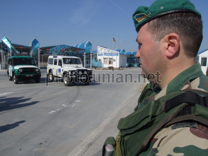 Боєць Чернівецького прикордонного загону на міжнародному автомобільному пункті пропуску “Росошани” (українсько-молдавський кордон, Кельменецький р-н Чернівецької обл.), в п’ятницю, 3 квітня 2009 р. Цього дня на МАПП “Росошани” вперше зустрілись прикордонники Чернівецького прикордонного загону з експертами польового офісу ”Атаки” (Молдова) спеціальної місії ”EUBAM” комісії Євросоюзу. Метою зустрічі було запровадження спільного патрулювання українсько-молдавського кордону на ділянці Чернівецького прикордонного загону. За словами начальника штабу Чернівецького прикордонного загону, в рамках проекту Держприкордонслужбою України вже отримано комп’ютерне обладнання та програмне забезпечення на суму 580 тис. євро. За його словами, також планується створення Регіонального тренінгового центру на базі Котовського прикордонного загону (Одеська обл.), на суму 1 млн. 615 тис. євро. Крім цього українська сторона отримає автомобілі високої прохідності, автобуси, тепловізори та радіокомутаційне обладнання на суму 2,5 млн. євро. Фото Сергія Зарайського / УНІАН