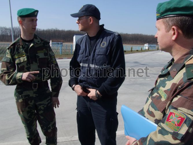 Співробітник спеціальної місії ”EUBAM” комісії Євросоюзу спілкується із прикордонниками на міжнародному автомобільному пункті пропуску “Росошани” (українсько-молдавський кордон, Кельменецький р-н Чернівецької обл.), в п’ятницю, 3 квітня 2009 р. Цього дня на МАПП “Росошани” вперше зустрілись прикордонники Чернівецького прикордонного загону з експертами польового офісу ”Атаки” (Молдова) спеціальної місії ”EUBAM” комісії Євросоюзу. Метою зустрічі було запровадження спільного патрулювання українсько-молдавського кордону на ділянці Чернівецького прикордонного загону. За словами начальника штабу Чернівецького прикордонного загону, в рамках проекту Держприкордонслужбою України вже отримано комп’ютерне обладнання та програмне забезпечення на суму 580 тис. євро. За його словами, також планується створення Регіонального тренінгового центру на базі Котовського прикордонного загону (Одеська обл.), на суму 1 млн. 615 тис. євро. Крім цього українська сторона отримає автомобілі високої прохідності, автобуси, тепловізори та радіокомутаційне обладнання на суму 2,5 млн. євро. Фото Сергія Зарайського / УНІАН