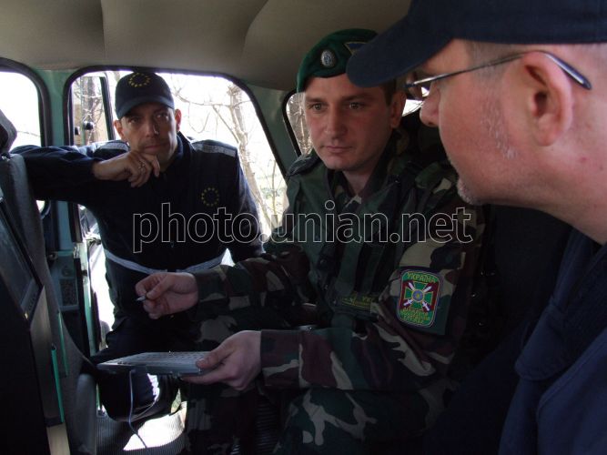 Співробітники спеціальної місії ”EUBAM” комісії Євросоюзу та прикордонник проводять спільне патрулювання на міжнародному автомобільному пункті пропуску “Росошани” (українсько-молдавський кордон, Кельменецький р-н Чернівецької обл.), в п’ятницю, 3 квітня 2009 р. Цього дня на МАПП “Росошани” вперше зустрілись прикордонники Чернівецького прикордонного загону з експертами польового офісу ”Атаки” (Молдова) спеціальної місії ”EUBAM” комісії Євросоюзу. Метою зустрічі було запровадження спільного патрулювання українсько-молдавського кордону на ділянці Чернівецького прикордонного загону. За словами начальника штабу Чернівецького прикордонного загону, в рамках проекту Держприкордонслужбою України вже отримано комп’ютерне обладнання та програмне забезпечення на суму 580 тис. євро. За його словами, також планується створення Регіонального тренінгового центру на базі Котовського прикордонного загону (Одеська обл.), на суму 1 млн. 615 тис. євро. Крім цього українська сторона отримає автомобілі високої прохідності, автобуси, тепловізори та радіокомутаційне обладнання на суму 2,5 млн. євро. Фото Сергія Зарайського / УНІАН