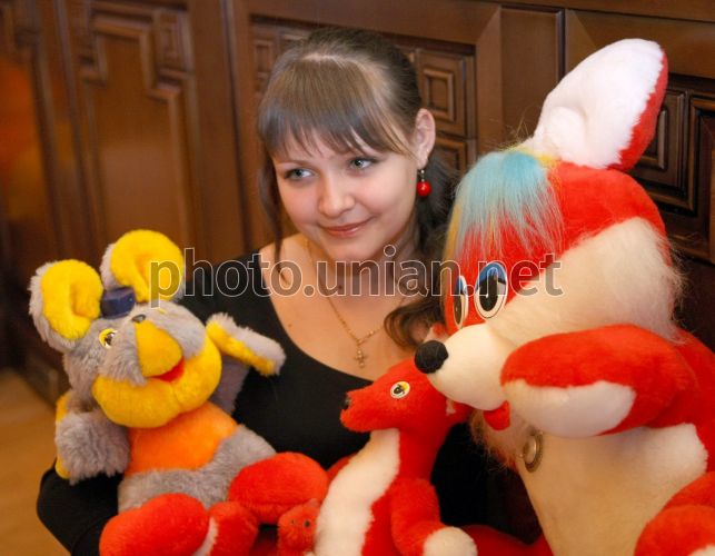 Юна майстриня з Вінниці Галина Крюк, сидить в оточенні іграшок, виготовлених нею, на відкритті своєї виставки ”Мужність і талант” у Президентському фонді «Україна», у Києві, в середу, 8 квітня 2009 р. Представляючи Галину Крюк, екс-президент України Леонід Кучма зазначив, що виставка має не випадкову назву, бо Галі з раннього дитинства доводиться боротися з важкою хворобою. На відкритті виставки Леонід Кучма вручив Галині Крюк грант Президентського фонду. Грант також отримала Єва Рабчевська, яка на урочистій церемонії виконала на скрипці свій власний твір. Фото Валерія Соловйова / УНІАН