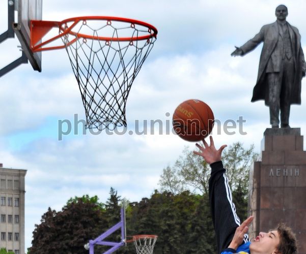 Учасник чемпіонату зі стрітболу ”Kharkiv Streetball battle” намагається закинути м’яч в корзину в Харкові, у суботу, 16 травня 2009 р. Стрітбол (вуличний баскетбол) з’явився у 1950-х рр. в бідних кварталах США. Дві команди грають на корті розміром в половину баскетбольного майданчика, забиваючи м’яч в одне і те ж кільце. Найпоширеніший вид стрітболу - 3 на 3 (у команді може бути 4 людини - 3 гравці і один запасний), проте в стрітбол грають і 2 на 2, і 1 на 1. Не існує єдиних правил стрітболу - учасники гри домовляються перед початком про правила, за якими проводитиметься гра. Гру 5 на 5, в два кільця на вулиці, також називають стрітболом. Правила 5 на 5 також відрізняються від правил класичного баскетболу, як і в решті різновидів стрітболу. Фото Ігоря Чекачкова / УНІАН