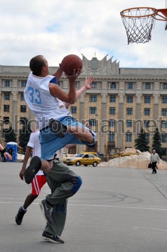Учасник чемпіонату зі стрітболу ”Kharkiv Streetball battle” намагається закинути м'яч в корзину в Харкові, у суботу, 16 травня 2009 р. Стрітбол (вуличний баскетбол) з’явився у 1950-х рр. в бідних кварталах США. Дві команди грають на корті розміром в половину баскетбольного майданчика, забиваючи м’яч в одне і те ж кільце. Найпоширеніший вид стрітболу - 3 на 3 (у команді може бути 4 людини - 3 гравці і один запасний), проте в стрітбол грають і 2 на 2, і 1 на 1. Не існує єдиних правил стрітболу - учасники гри домовляються перед початком про правила, за якими проводитиметься гра. Гру 5 на 5, в два кільця на вулиці, також називають стрітболом. Правила 5 на 5 також відрізняються від правил класичного баскетболу, як і в решті різновидів стрітболу. Фото Ігоря Чекачкова / УНІАН