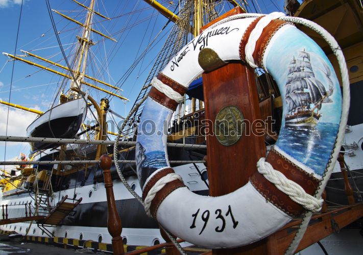 Рятівний круг на учбовому кораблі ВМС Італії - паруснику ”Амеріго Веспуччі”, в Одесі, у четвер, 20 серпня 2009 р. Цього дня в рамках навчального походу в порт Одеси прибув навчальний корабель ВМС Італії - парусник ”Амеріго Веспуччі”, визнаний одним з найвеличніших кораблів світу. ”Амеріго Веспуччі” – парусник з двигуном, з піднятими вітрилами, він може розвивати швидкість до 14,6 вузлів (27 км/год.). Корпус корабля виготовлено зі сталі, але багато елементів корабля зроблено з дерева. Маневрування вітрилами і переміщення рей здійснюється тільки вручну за допомогою канатів із рослинного волокна (коноплі). Загальна довжина цих канатів більш як 30 км. Окрім двигуна, переважна більшість устаткування на борту має ручне управління, пов’язане з маневруванням вітрилами. Справжнім ”двигуном” корабля ”Амеріго Веспуччі” може вважатися його екіпаж, що складається з 278 чоловік (з них 16 офіцерів, 72 мічмани і 190 матросів). Під час навчального походу екіпаж поповнюється приблизно 120 курсантами і викладачами Військово-Морської академії, таким чином, загальна кількість екіпажа становить 450 чоловік. Повне підняття вітрил судна передбачає участь приблизно 200 членів екіпажа, тобто половину всього особового складу, який перебуває на борту корабля. Для виконання таких дій необхідно приблизно 60 хвилин. Фото Олексія Кравцова / УНІАН