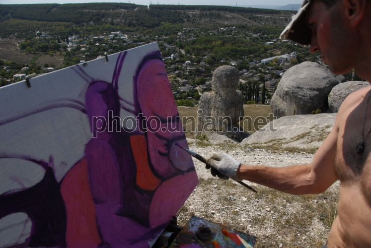 Художник Михайло Гайовий малює картину в ході 12-го всеукраїнського Севастопольського художнього пленера, в Бахчисараї (Крим), в четвер, 10 вересня 2009 р. За минулі роки в місто-герой приїжджали немало іменитих художників. На цей раз до Севастополя також приїхала велика група заслужених і народних художників України. Фото Олександра Юрченка / УНИАН