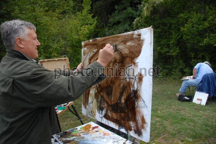 Художник Олег Приходько малює картину в ході 12-го всеукраїнського Севастопольського художнього пленера, в с.Соколине (Крим), в понеділок, 21 вересня 2009 р. За минулі роки в місто-герой приїжджали немало іменитих художників. На цей раз до Севастополя також приїхала велика група заслужених і народних художників України. Фото Олександра Юрченка / УНИАН