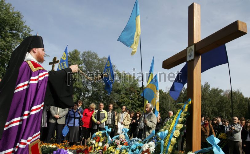 Священнослужитель освячує відновлений Пам’ятний хрест та меморіальну дошку на честь учасників антифашистського підпілля ОУН, загиблих в Бабиному Яру, під час церемонії відкриття, в Києві, у понеділок, 28 вересня 2009 р. Фото Володимира Гонтара / УНІАН