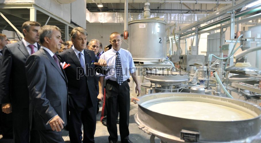 Президент України Віктор Ющенко, другий праворуч, під час огляду заводу ТОВ «Церсаніт Інвест», в с.Чижівка (Житомирська обл.), у вівторок, 29 вересня 2009 р. Цього дня в рамках робочої поїздки на Житомирщину Президент України Віктор Ющенко взяв участь у відкритті заводу ООО «Церсаніт Інвест» в селі Чижівка. Президент звернув увагу на той факт, що продукція «Церсаніт Інвест» заміщатиме імпорт і орієнтована на експорт. Віктор Ющенко назвав реалізацію даного проекту гарним прикладом і того, як через здорову інвестиційну економічну політику ефективно реалізовуватиметься не тільки потенціал однієї області, але і робота на задоволення національних інтересів. Президент особливо відзначив, що реалізація даного проекту стала можливою - окрім зусиль інвесторів - завдяки професійній роботі органів місцевого самоврядування. Фото Миколи Лазаренка / POOL / УНІАН