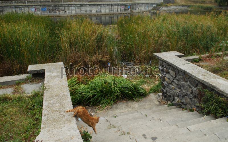 Кіт стрибає на сходи на березі Блакитного озера в Києві, в середу, 7 жовтня 2009 р. Озеро і територія навколо нього перетворилося на міні-звалище. За словами місцевих жителів, ЖЕК вже декілька місяців не проводить прибирання на території Блакитного озера, оскільки відбулася втрата документації на озеро при перерозподілі кордонів між Подільським і Шевченківським районами. Мешканці мікрорайону впевнені, що на місці озера скоро може з’явитися будмайданчик. Найближчим часом вони мають намір провести на території навколо озера суботник. Фото УНІАН