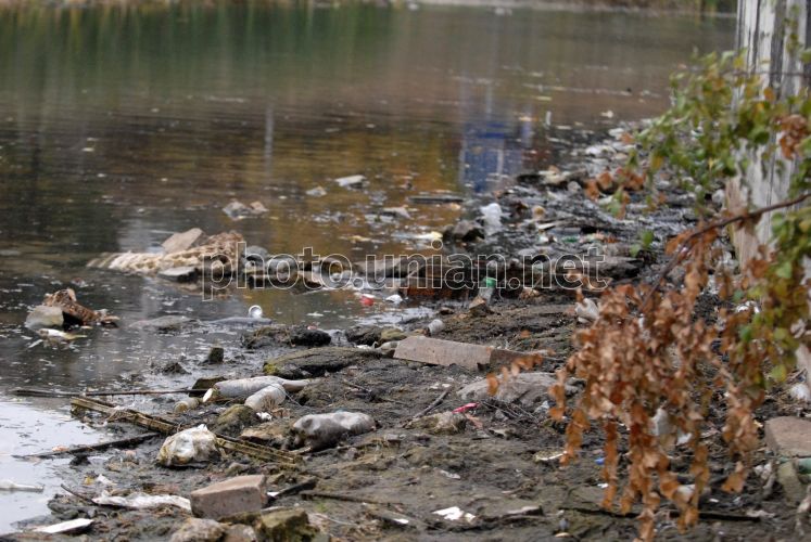 Сміття на березі Блакитного озера в Києві, в середу, 7 жовтня 2009 р. Озеро і територія навколо нього перетворилося на міні-звалище. За словами місцевих жителів, ЖЕК вже декілька місяців не проводить прибирання на території Блакитного озера, оскільки відбулася втрата документації на озеро при перерозподілі кордонів між Подільським і Шевченківським районами. Мешканці мікрорайону впевнені, що на місці озера скоро може з’явитися будмайданчик. Найближчим часом вони мають намір провести на території навколо озера суботник. Фото УНІАН