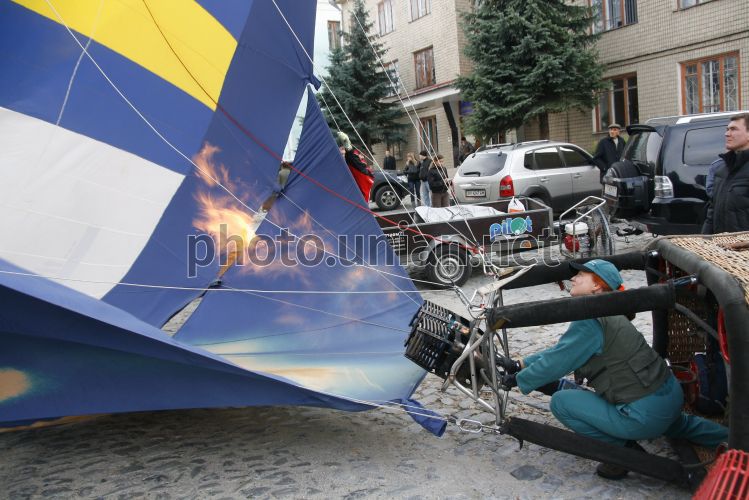 Жінка-пілот теплового аеростату Тетяна Бейдик надуває його гарячим повітрям перед стартом під час святкування 225-річчя повітроплавання в Україні, в Кам’янець - Подільському, в суботу, 17 жовтня 2009 р. В рамках програми фестивалю пройшов запуск повітряних куль та паперових повітряних куль пам’яті видатних повітроплавців. Крім того, пройшли театралізовані вистави та лазерне шоу. Фото Ірини Пустиннікової / УНІАН