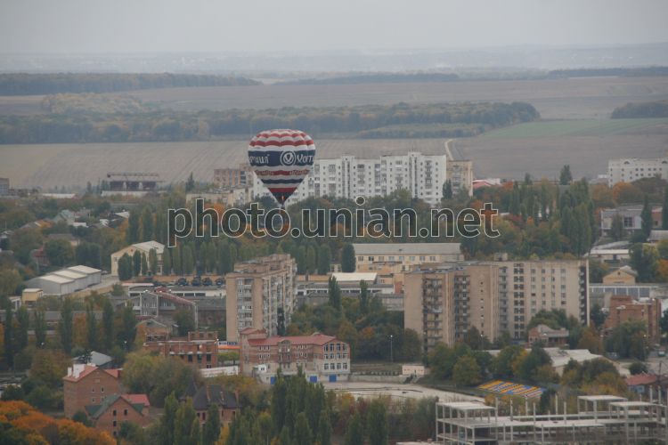 Повітряні кулі під час святкування 225-річчя повітроплавання в Україні пролітають над Кам’янець - Подільськом, в суботу, 17 жовтня 2009 р. В рамках програми фестивалю пройшов запуск повітряних куль та паперових повітряних куль пам’яті видатних повітроплавців. Крім того, пройшли театралізовані вистави та лазерне шоу. Фото Ірини Пустиннікової / УНІАН