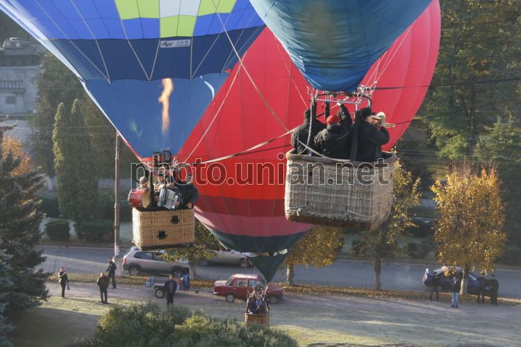 Повітряні кулі під час святкування 225-річчя повітроплавання в Україні пролітають над Кам’янець - Подільськом, в суботу, 17 жовтня 2009 р. В рамках програми фестивалю пройшов запуск повітряних куль та паперових повітряних куль пам’яті видатних повітроплавців. Крім того, пройшли театралізовані вистави та лазерне шоу. Фото Ірини Пустиннікової / УНІАН