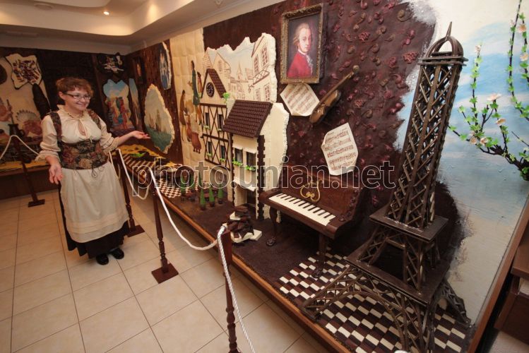 Співробітниця музею шоколаду демонструє експонати, в Сімферополі (Крим), у п’ятницю, 23 жовтня 2009 р. У Сімферополі відкрився єдиний в Україні музей шоколаду. Півтори тонни цього солодкого продукту знадобилися кримським кондитерам, щоб відтворити історію шоколаду. Всі експонати музею - ручної роботи і в єдиному екземплярі. Експозиція починається з дерева какао, поряд - фігури індійців, які першими почали вживати шоколад. Серед експонатів - портрети видатних осіб, які любили цей продукт. Портрети, пейзажі, натюрморти - все це теж написано шоколадом. Гордість експозиції - Ейфелева башта - найскладніша шоколадна конструкція в музеї. Кондитери запевняють, що шоколадні експонати можуть стояти більше 5 років і не втрачати красивого зовнішнього вигляду і якостей. Єдина умова - щоденне прибирання пилу та відповідний температурний режим.Фото Олексія Сувірова / УНІАН