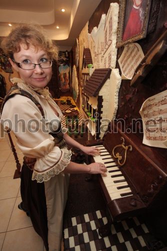 Співробітниця музею шоколаду демонструє один з експонатів - піаніно, зроблене з шоколаду, в Сімферополі (Крим), у п’ятницю, 23 жовтня 2009 р. У Сімферополі відкрився єдиний в Україні музей шоколаду. Півтори тонни цього солодкого продукту знадобилися кримським кондитерам, щоб відтворити історію шоколаду. Всі експонати музею - ручної роботи і в єдиному екземплярі. Експозиція починається з дерева какао, поряд - фігури індійців, які першими почали вживати шоколад. Серед експонатів - портрети видатних осіб, які любили цей продукт. Портрети, пейзажі, натюрморти - все це теж написано шоколадом. Гордість експозиції - Ейфелева башта - найскладніша шоколадна конструкція в музеї. Кондитери запевняють, що шоколадні експонати можуть стояти більше 5 років і не втрачати красивого зовнішнього вигляду і якостей. Єдина умова - щоденне прибирання пилу та відповідний температурний режим.Фото Олексія Сувірова / УНІАН