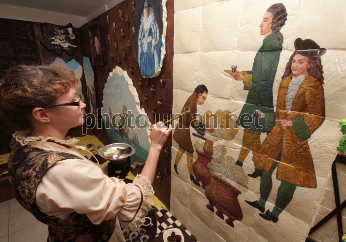 Співробітниця музею шоколаду розфарбовує шоколадними фарбами один з експонатів - малюнок, на якому зображено процес приготування шоколаду, в Сімферополі (Крим), у п’ятницю, 23 жовтня 2009 р. У Сімферополі відкрився єдиний в Україні музей шоколаду. Півтори тонни цього солодкого продукту знадобилися кримським кондитерам, щоб відтворити історію шоколаду. Всі експонати музею - ручної роботи і в єдиному екземплярі. Експозиція починається з дерева какао, поряд - фігури індійців, які першими почали вживати шоколад. Серед експонатів - портрети видатних осіб, які любили цей продукт. Портрети, пейзажі, натюрморти - все це теж написано шоколадом. Гордість експозиції - Ейфелева вежа - найскладніша шоколадна конструкція в музеї. Кондитери запевняють, що шоколадні експонати можуть стояти більше 5 років і не втрачати красивого зовнішнього вигляду і якостей. Єдина умова - щоденне прибирання пилу та відповідний температурний режим.Фото Олексія Сувірова / УНІАН