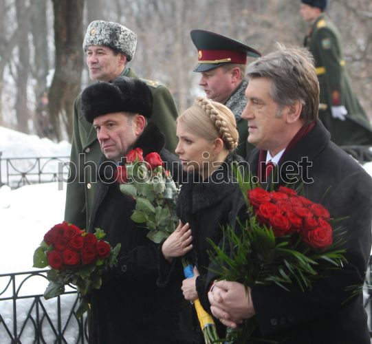 Справа наліво - Президент України Віктор Ющенко, прем’єр-міністр Юлія Тимошенко та перший заступник голови Київської міської державної адміністрації Анатолій Голубченко під час покладання квітів до пам’ятного знаку Героям Крут на Аскольдовій могилі, в Києві, у п’ятницю, 29 січня 2010 р. Цього дня Україна вшановує пам’ять Героїв Крут. 92 роки тому три сотні київських студентів вступили в нерівний бій з шеститисячною більшовицькою армією, захищаючи Українську народну республіку. Фото Олександра Прокопенка / POOL / УНІАН