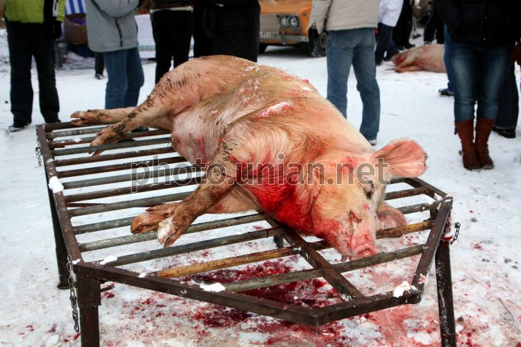 Зарізана учасниками IV-го фестивалю різників свиня у с. Геча (Берегівський р-н, Закарпатська обл.), в суботу, 30 січня 2010 р. У IV-му фестивалі різників взяли участь 2 команди з Угорщини та 4 - із сіл Берегівського району. Головний приз для команди-переможця конкурсу - 120-кілограмова свиня. В рамках фестивалю відбулося частування учасників конкурсу гарячим вином та домашнім самогоном (сливовицею), відлов свиней, традиційне обпалення туш соломою, приготування традиційних страв зі свинини, розважально-музичне змагання, дегустація вин місцевих виноробів, дегустація та ярмарок традиційних страв зі свинини, народні пісні і танці за участю гостей фестивалю. Із понад 500 кг свіжини під час фестивалю його учасники приготували чимало смачних страв. 1 кг сала коштував 25 - 40 грн., ковбаса - до 70 грн. Фото Яноша Немеша / УНІАН