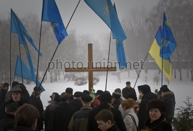 Пам’ятний хрест українській поетесі та літературному критику Олені Теліги під час поминального віче, присвяченого шануванню пам’яті членів Організації українських націоналістів, розстріляних німецькими окупантами в лютому 1942 року в Бабиному Яру, в Києві, в неділю, 21 лютого 2010 р. Фото Сергія Светлицького / УНІАН