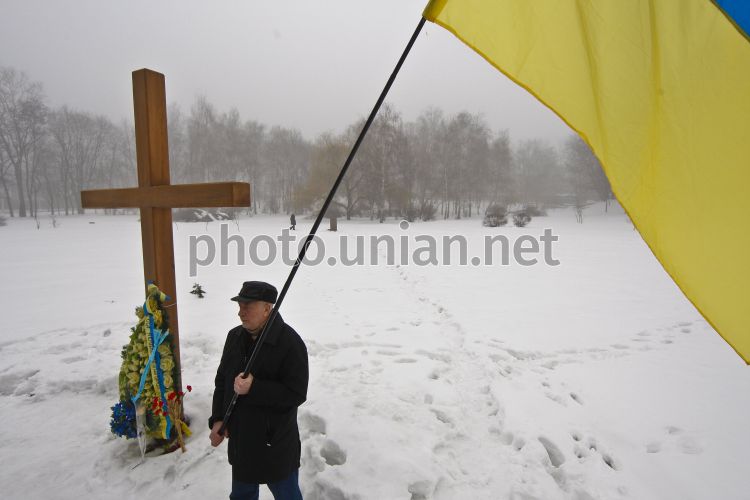 Пам’ятний хрест українській поетесі та літературному критику Олені Теліги під час поминального віче, присвяченого шануванню пам’яті членів Організації українських націоналістів, розстріляних німецькими окупантами в лютому 1942 року в Бабиному Яру, в Києві, в неділю, 21 лютого 2010 р. Фото Сергія Светлицького / УНІАН