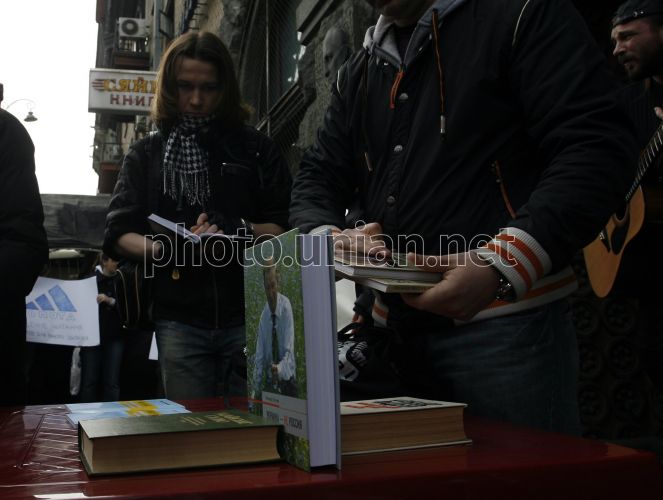 Стенд з книгами на продаж під час проведення акції «Народний книжковий магазин» біля книжкового магазина «Сяйво», у Києві, в суботу, 20 березня 2010 р. Захід проходив в стилі вуличного концерту, в рамках якого кожен охочий може виступити, продекламувати свої твори, або ж висловитися на тему захисту книжкового магазина. Фото Андрія Скакодуба / УНІАН