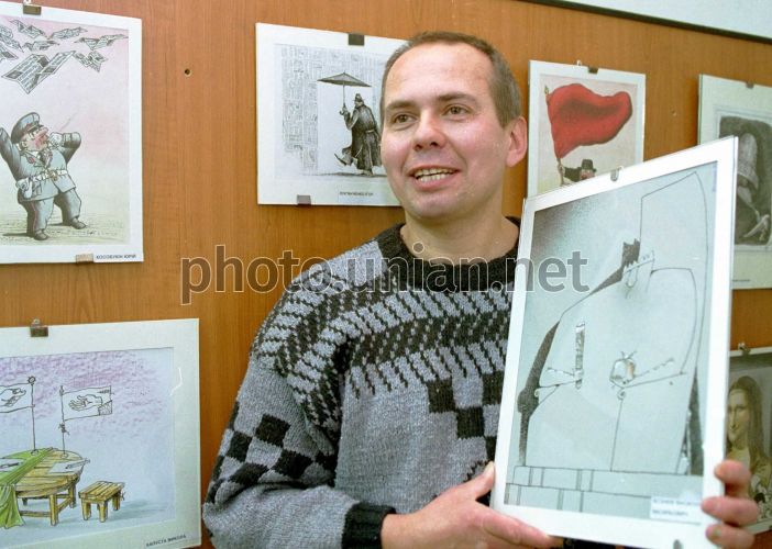 Переможець першого україно-французького конкурсу карикатур Василь Вознюк із своєю роботою в руках на офіційному відкритті виставки карикатур "Преса і влада" за підсумками першого україно-французького конкурсу в понеділок, 18 грудня 2000р. Конкурс провів Інститут масової інформації за підтримкою Міжнародної правозахисної організації "Репортерів без меж", профспілки щоденних газет Франції "EUROPEQN", посольства Франції в Україні, і при сприянні Національного союзу журналістів України в березні 2000р. У конкурсі взяли участь 28 карикатуристів із 8-ми областей України. Вознюка очікує персональна виставка в Парижі на початку лютого 2001р.