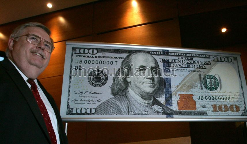Посол США в Україні Джон Теффт після закінчення презентації нового дизайну 100-доларової купюри, у Києві, в середу, 21 квітня 2010 р. Федеральна резервна система США вводить в обіг 100-доларову купюру нового дизайну 10 лютого 2011 р. Посол США в Україні на презентації підкреслив, що зміна дизайну викликана необхідністю підвищити рівень захисту доларів від підробки у всьому світі, зокрема в Україні, де кількість фальшивих доларів в обігу є значною. У свою чергу прес-аташе посольства США в Україні пояснила, які нові елементи дизайну одержить нова 100-доларова купюра. Нові риси - тривимірна захисна стрічка, як захисний елемент, і також зображення дзвоника в чорнильниці. Тривимірна захисна стрічка - це блакитна стрічка на лицьовому боці купюри. Ця стрічка не надрукована, а вшита в папір. Там 100 млн. мікролінз, які дають враження рухомих дзвіночків. Також ця банкнота має зображення дзвоника в чорнильниці. Це дзвоник, що змінює свій колір. Його колір мідний, поки не рухається купюра. Потім дзвоник змінює свій колір на зелений. Прес-аташе також сказала, що нова банкнота зберегла ряд захисних елементів з попереднього дизайну, водяний знак у вигляді портрета залишається на новій купюрі. Ще одна ефективна межа захисту, який залишився від прогресивного дизайну, це захисна нитка. Якщо засвітити нитку ультрафіолетом, то нитка засіяє рожевим кольором. Також елемент захисту - цифра 100 в нижньому правому кутку, яка змінює колір при нахилі купюри. Щодо вартості виготовлення однієї 100-доларової купюри нового дизайну, то вона виросла, порівняно з попереднім дизайном, на 3,5 центів. Фото Олександра Синиці / УНІАН