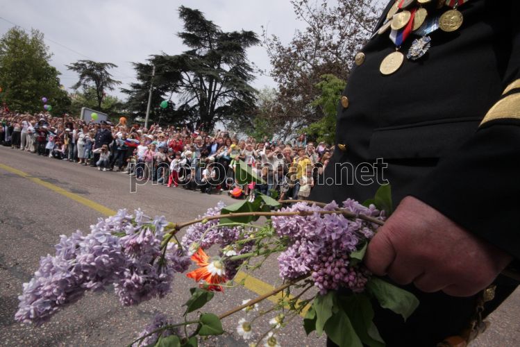 Ветеран Великої Вітчизняної війни тримає бузок під час параду Переможців з нагоди 65-ї річниці Перемоги у Великій Вітчизняній війні, в Севастополі (Крим), в неділю, 9 травня 2010 р. У центрі Севастополя понад 50 тисяч чоловік - учасників Параду Переможців, проходження військ гарнізону, жителів і гостей міста - взяли участь у святкуванні 65-ї річниці Перемоги у Великій Вітчизняній війні і 66-ї річниці звільнення міста від німецько-фашистських загарбників. Фото Олексія Сувірова / УНІАН