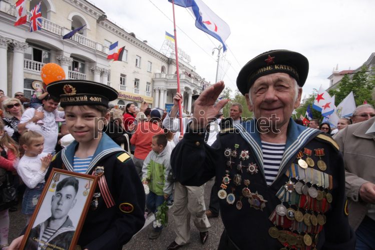 Ветеран Великої Вітчизняної війни та хлопчик у формі моряка під час параду Переможців з нагоди 65-ї річниці Перемоги у Великій Вітчизняній війні, в Севастополі (Крим), в неділю, 9 травня 2010 р. У центрі Севастополя понад 50 тисяч чоловік - учасників Параду Переможців, проходження військ гарнізону, жителів і гостей міста - взяли участь у святкуванні 65-ї річниці Перемоги у Великій Вітчизняній війні і 66-ї річниці звільнення міста від німецько-фашистських загарбників. Фото Олексія Сувірова / УНІАН