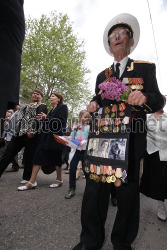 Ветеран Великої Вітчизняної війни тримає медалі і чорно-білі фотографії під час параду Переможців з нагоди 65-ї річниці Перемоги у Великій Вітчизняній війні, в Севастополі (Крим), в неділю, 9 травня 2010 р. У центрі Севастополя понад 50 тисяч чоловік - учасників Параду Переможців, проходження військ гарнізону, жителів і гостей міста - взяли участь у святкуванні 65-ї річниці Перемоги у Великій Вітчизняній війні і 66-ї річниці звільнення міста від німецько-фашистських загарбників. Фото Олексія Сувірова / УНІАН