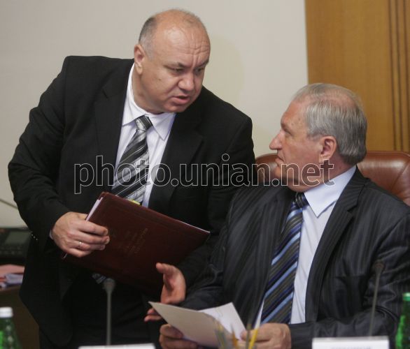 Віце-прем’єр-міністр Віктор Тихонов, праворуч, та міністр економіки Василь Цушко під час засідання Кабінету міністрів України, в Києві, в середу, 12 травня 2010 р. В ході засідання Прем’єр-міністр України повідомив про те, що Уряд впродовж поточного року планує, щонайменше, п’ять разів підвищувати мінімальні зарплати і посадові оклади в бюджетній сфері. При цьому він також повідомив, що на сьогоднішньому засіданні Кабмін планує ухвалити постанову, що регулює підвищення посадових окладів у бюджетній сфері, і уточнив, що, перш за все, підвищуватиметься тарифна ставка до посадового окладу для першого тарифного розряду Єдиної тарифної сітки. При цьому прем’єр-міністр зазначив, що підвищення посадових окладів буде здійснене для більш як 3,5 млн. працівників освіти, культури, охорони здоров’я, науки тощо. Фото Олександра Синиці / УНІАН