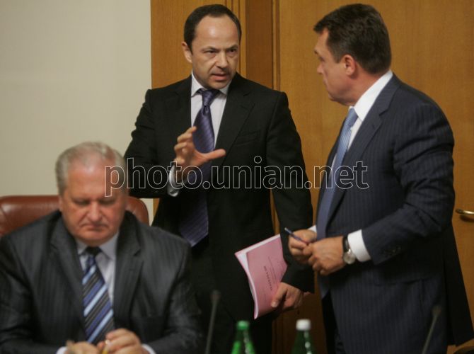 Зліва направо: віце-прем’єр-міністр Віктор Тихонов, віце-прем'єр-міністр України з питань економіки Сергій Тігіпко та віце-прем'єр-міністр Володимир Семиноженко під час засідання Кабінету міністрів України, в Києві, в середу, 12 травня 2010 р. В ході засідання Прем’єр-міністр України повідомив про те, що Уряд впродовж поточного року планує, щонайменше, п’ять разів підвищувати мінімальні зарплати і посадові оклади в бюджетній сфері. При цьому він також повідомив, що на сьогоднішньому засіданні Кабмін планує ухвалити постанову, що регулює підвищення посадових окладів у бюджетній сфері, і уточнив, що, перш за все, підвищуватиметься тарифна ставка до посадового окладу для першого тарифного розряду Єдиної тарифної сітки. При цьому прем’єр-міністр зазначив, що підвищення посадових окладів буде здійснене для більш як 3,5 млн. працівників освіти, культури, охорони здоров’я, науки тощо. Фото Олександра Синиці / УНІАН